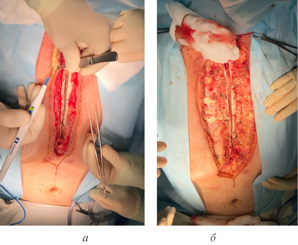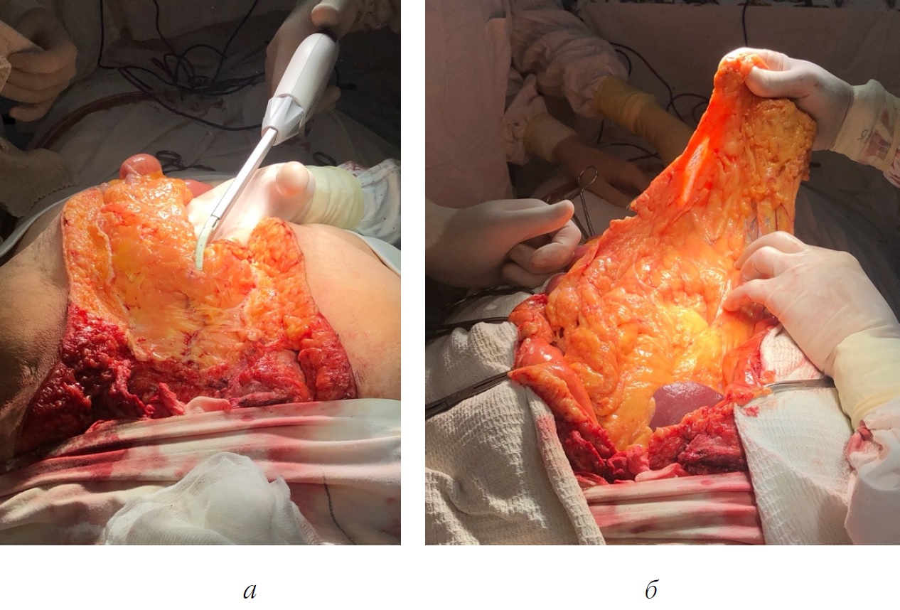 Рис. 3. Применение аппарата LigaSure для изоляции лоскута сальника (а), ревизия выделенного лоскута для дальнейшей ротации и перемещения на дефект грудины (б)