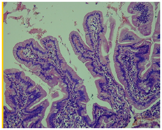 Гистоархитектоника слоев стенки двенадцатиперстной кишки была относительно сохранена. Отмечались уменьшение высоты ворсин и сглаженность рельефа слизистой оболочки. Покровный эпителий выглядел уплощенным, ядра клеток с базальным расположением, надъядерная часть с участками просветления, местами вакуолизирована. В апикальных отделах ворсинок отмечено уменьшение числа бокаловидных клеток, в базальных отделах ворсинок их число увеличивалось. На одну ворсину приходилось две, три крипты (рис. 1).