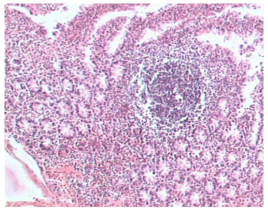 В ряде случаев в слизистой оболочке двенадцатиперстной кишки отмечалось формирование лимфоидных фолликулов с четкой клеточной структурой, местами со слабовыраженной макрофагальной реакцией в центральных отделах (рис. 2).