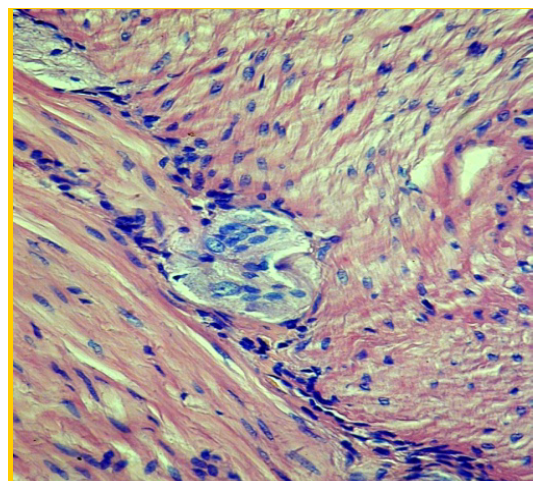 Мышечный слой кишечной стенки был выражен неодинаково в разных срезах, мышечные клетки имели разную толщину, с признаками гипертрофии или атрофии. Но преобладали случаи утолщения мышечного слоя. Отмечены дистрофические изменения мышечных волокон. Изменения межмышечных нервных ганглиев характеризовались уменьшением их в объеме за счет субатрофических процессов, полнокровия периганглионарных зон на фоне умеренного отека (рис. 3).