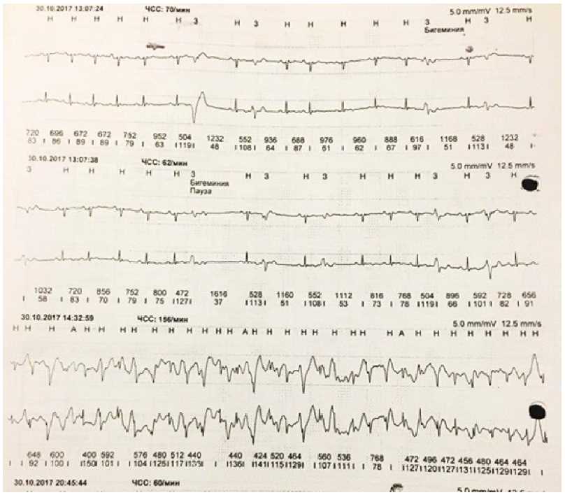 Длительное мониторирование ЭКГ от 30.10.2017: основной ритм синусовый с ЧСС 62 в мин (46–156 в мин). За время исследования зарегистрированы частые ЖЭС – 379, до 50 в час, полиморфные (2-го типа), в том числе эпизоды аллоритмии. Одиночные НЖЭС – 2. Пауз нет. Динамических изменений ST, Т не найдено (рисунок).