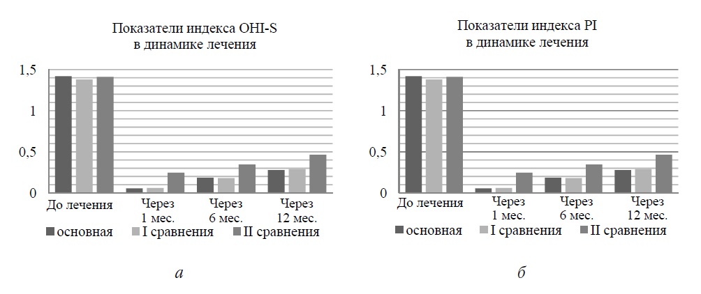 Рис. 1. Динамика гигиенического и пародонтального показателей в процессе наблюдения: а – OHI2S (J.C. Green, J.R. Vermillion); б – PI (А. Russel)