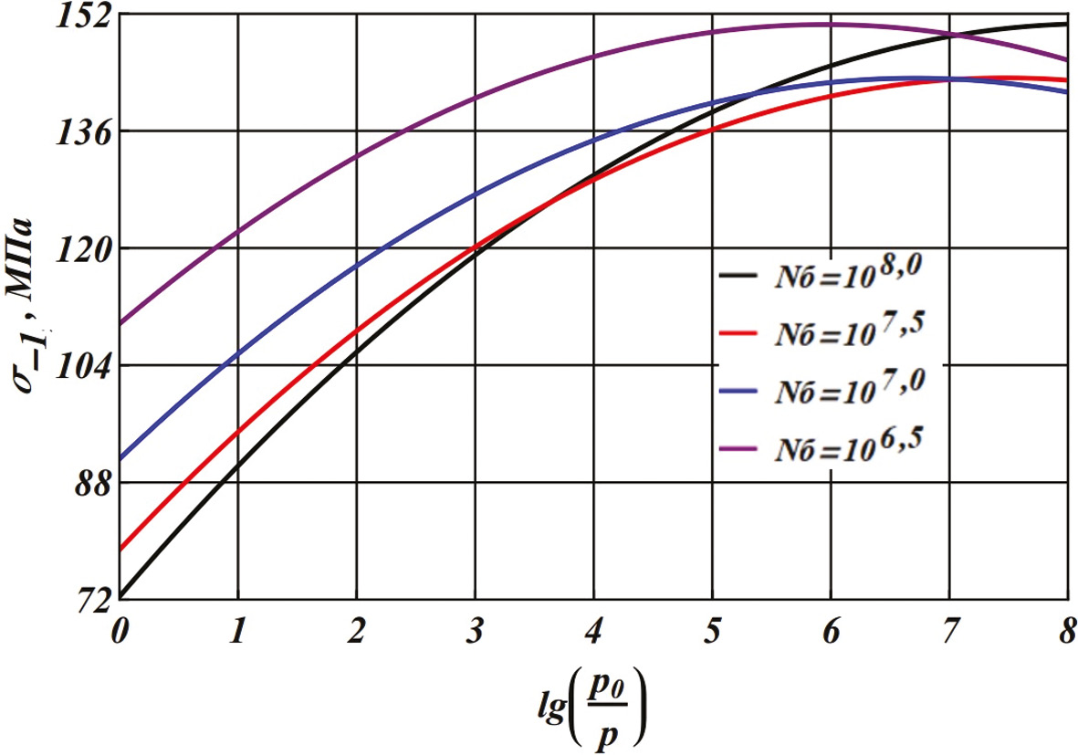 Можно видеть, что на интересующей области отсутствуют какие-либо аномальные колебания и экстремумы, а с возрастанием степени вакуума предел выносливости (в каждом сечении по определенной базе) асимптотически стремится к фиксированной величине, что отражает физический смысл протекающих динамических процессов. В настоящей работе произведена сверка с известными результатами подобных исследований. На рис. 2 приведены срезы поверхности усталости по нескольким базам испытаний. Для базы в 100 миллионов циклов и низкого вакуума значение предела выносливости хорошо соотносится с экспериментальными данными других авторов [4]. Характерно, что до среднего вакуума модель полностью отвечает физическому смыслу, охватывая области полета авиационной техники и верхних ступеней ракет, а отклонения в более разреженной зоне объясняются наличием допустимой ошибки величиной в 5 %.