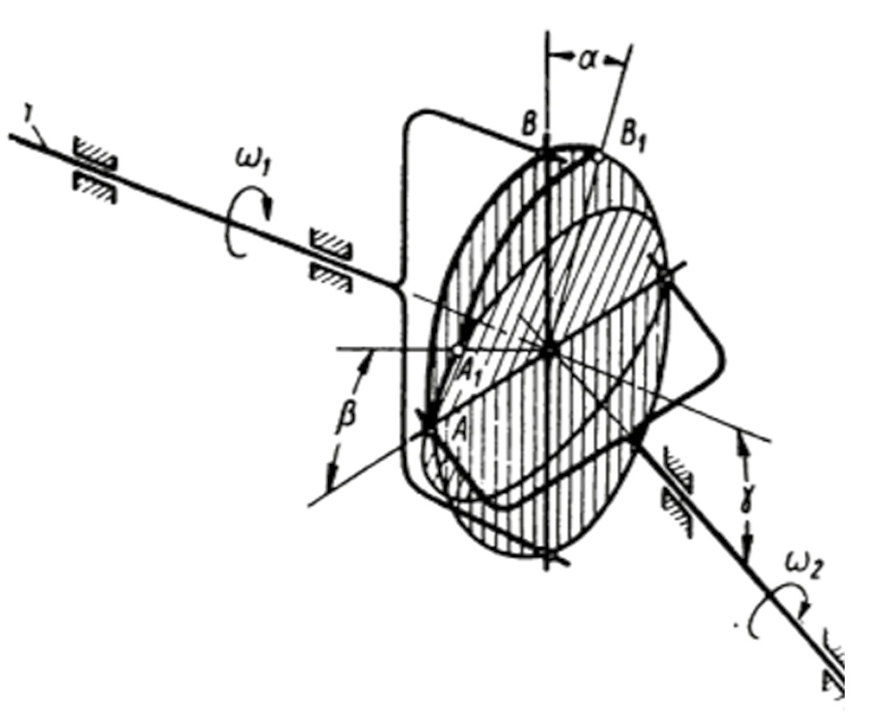 Рассмотрим кинематику кардана с крестовиной, у которого оси цапф пересекаются в одном центре.
