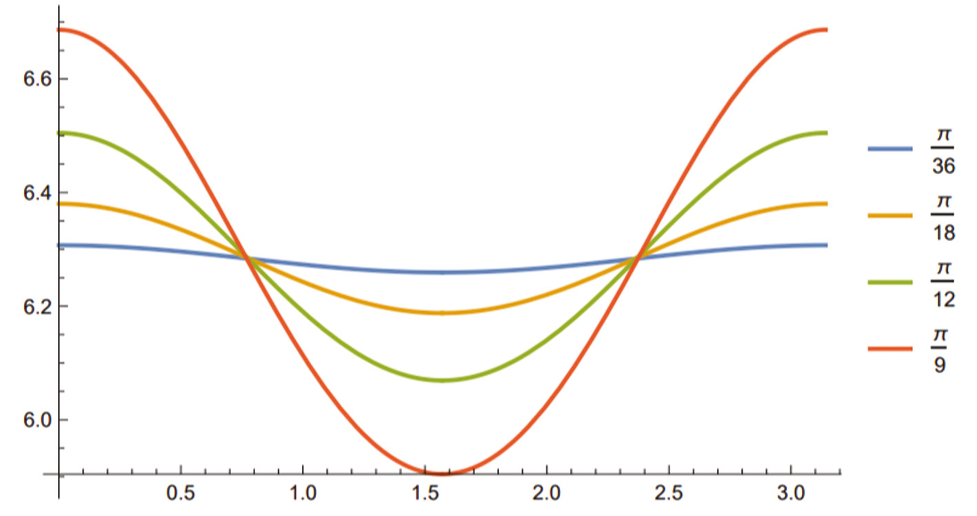 Для представления, как изменяется угловая скорость ведомого вала ω2 в зависимости от угла α поворота ведущего вала при различных значениях угла наклона валов, изображен график, построенный для углов γ, равных 5° (π/36), 10° (π/18), 15° (π/12) и 20° (π/9). Угловая скорость ведущего вала ω1 = π30.