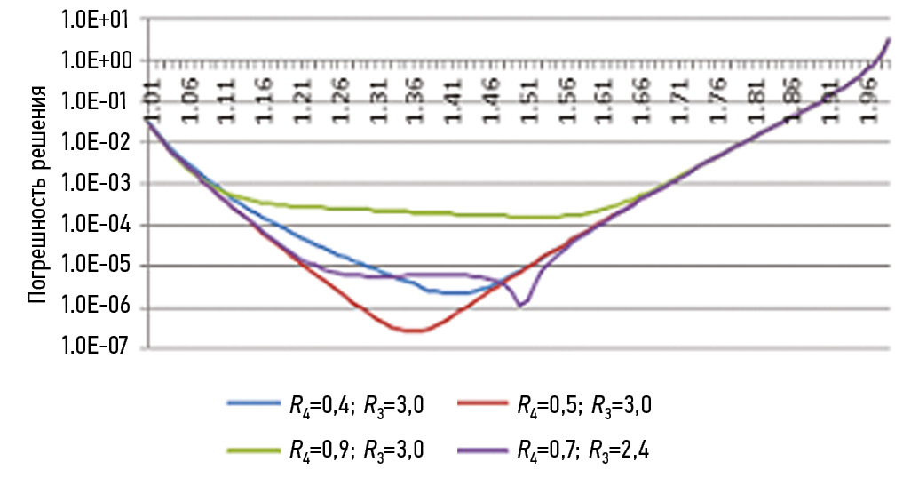 Рис. 1. Погрешность решения краевой задачи в кольце в зависимости от выбора вспомогательных контуров